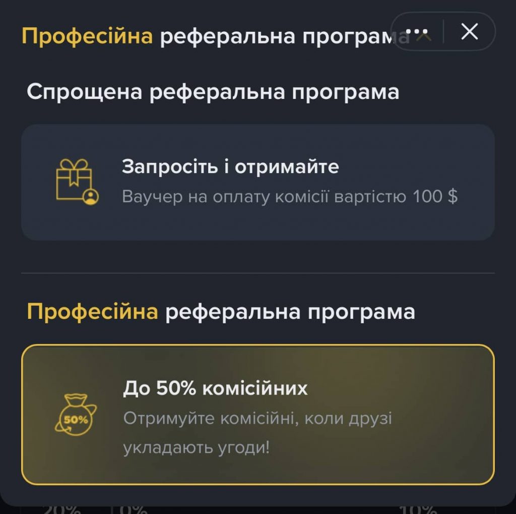 • Спрощена реферальна програма Binance — підходить новачкам і тим, кому важлива простота: дає одноразові ваучери на повернення комісії для запрошених, але не дозволяє отримувати комісійні з їхніх угод.